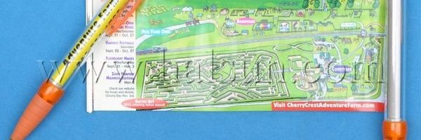 scroll map pensNormal size ballpoint pens contain a scroll out offset printed custom designed map at low price. The map is self-retractable to transparent barrel. Map only show up after pull the aluminum bar out. And it’s both sides. It could be an index map for new visitors of fair/tourist area/google map of your company location/shopping center. Thus, your clients get a graphic impresion of your company/tourist area/shopping center. And they can keep using the scroll map pens as it’s also a high quality ballpoint pens!
